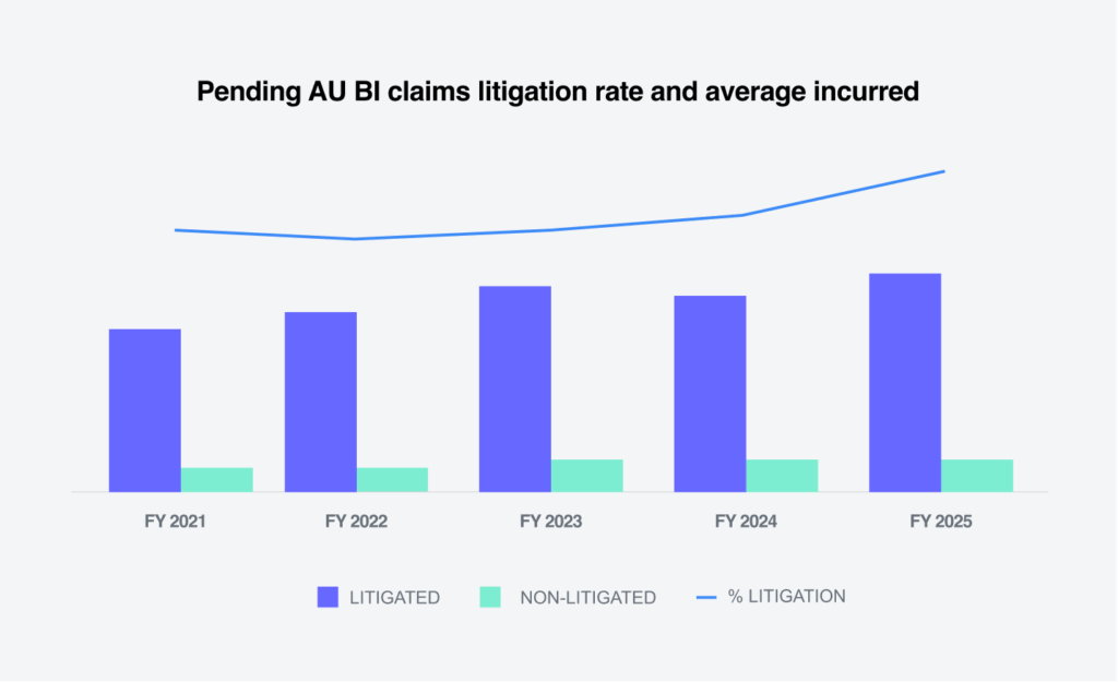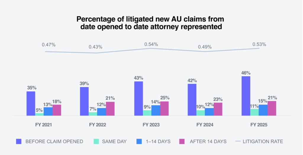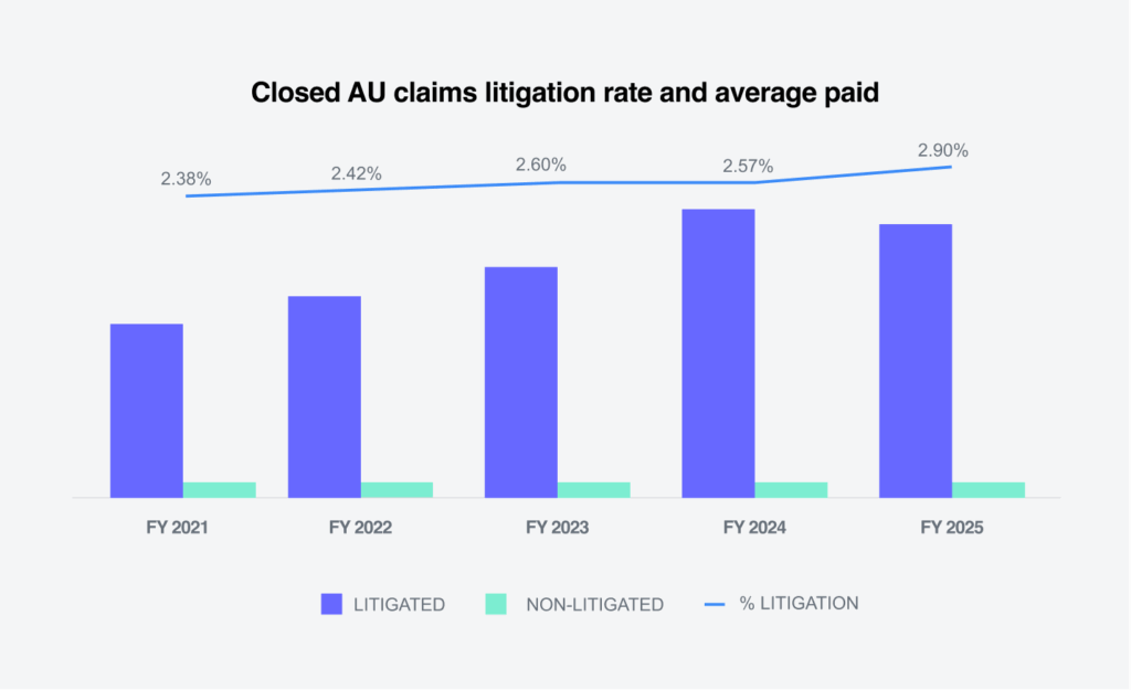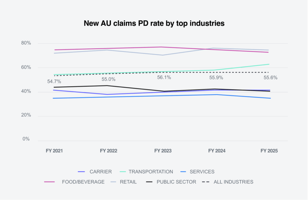 For new claims, the average litigation rate across all industries was 0.5%, which is consistent with the FY 2024 rate. The transportation sector continued to have the highest litigation rate at 0.9%.