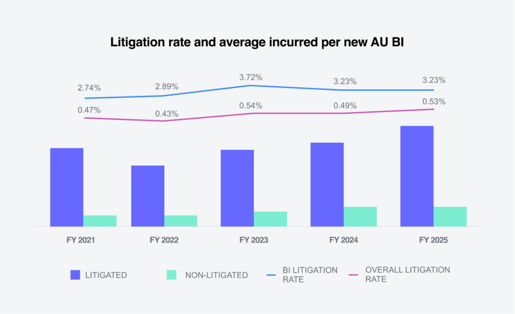 The litigation rate for new bodily injury claims remained flat at 3.2% in comparison to FY 2024. The average incurred on new bodily injury litigated claims increased 15.2%. The average incurred on non-litigated new bodily injury claims also increased by 22.3%. The average incurred on new bodily injury litigated claims was six times greater than non-litigated claims.