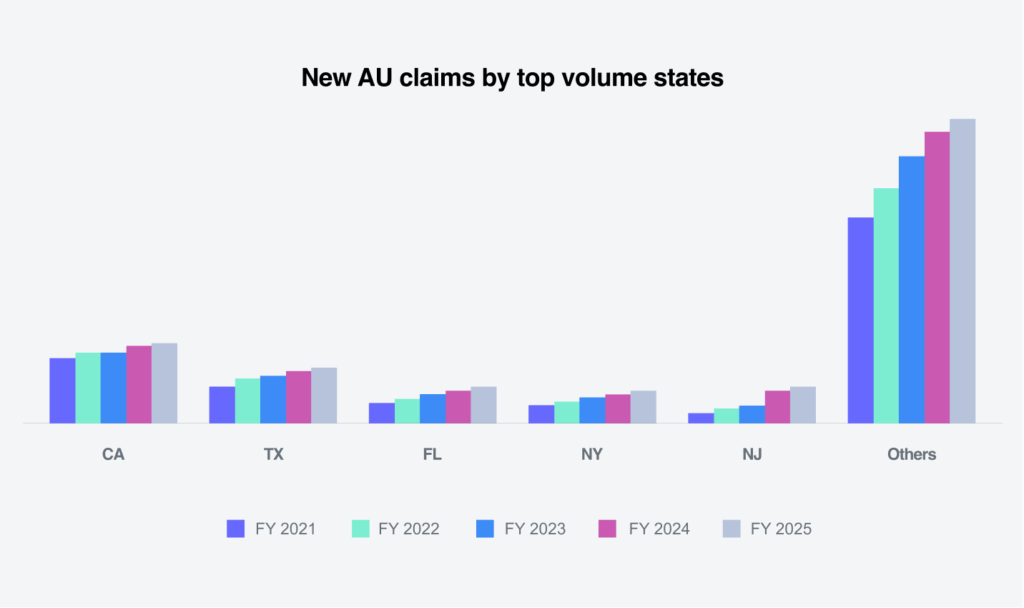 Our practice team uses JURIS claims data to perform comparative analyses informed by their expertise and analytics. The data in this report is based on both insured and self-insured claims for all states across five, 12-month periods (referred to as FY) from July 1, 2021, through June 30, 2025.